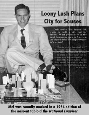 Mel Johnson came from money. His grandfather, a shipping tycoon, had left an inheritance to Johnson’s father, a Playboy who burned through his money faster than an arsonist on National Nobody Look At The Abandoned Warehouse District Day. When Johnson was 17, however, his father died in the rich noble tradition shared by Sonny Bono and one of the Kennedys- by skiing himself to death. Johnson took his inheritance and invested it in uranium in the 1940s. By 1951, Mel Johnson was worth roughly half a million dollars, which estimates from grandparents and geriatrics everywhere would inform you would have been more than enough to purchase roughly 10 million slices of blueberry pie cooled on the window sill, as well as an additional 5 million movie theatre tickets and 50 million sticks of liquorish way back then. So, he was sitting on a pretty big pile of money. But, was it build a booze city kind of money?