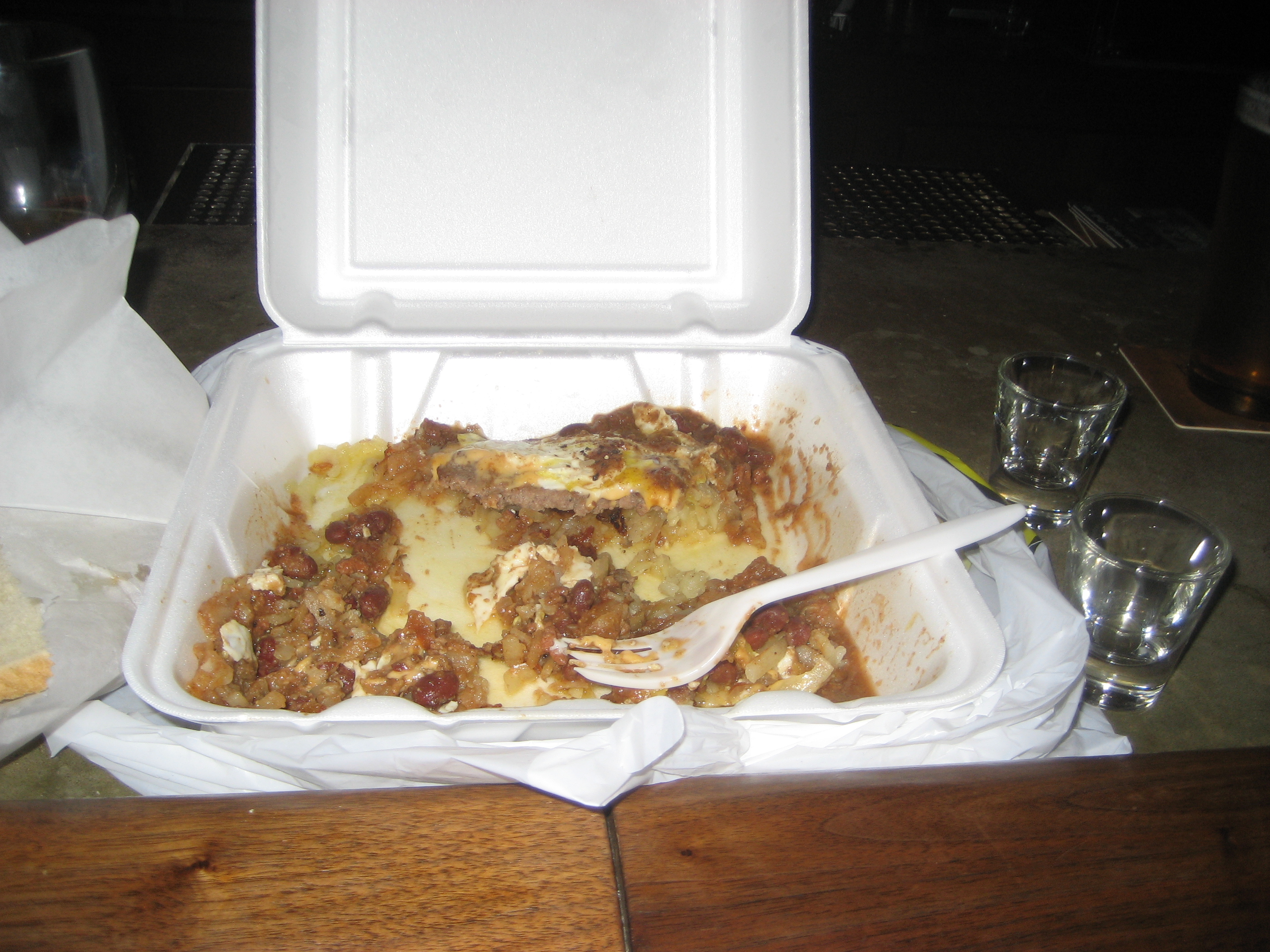 I’m almost at my full level of American food consumption. Almost. I just need one thing. Something I heard about years ago, as a ghost of Chicago food. The Slinger, a bed of hash browns with two hamburger patties with two fried eggs dowsed in onions and chili. If I could find that…