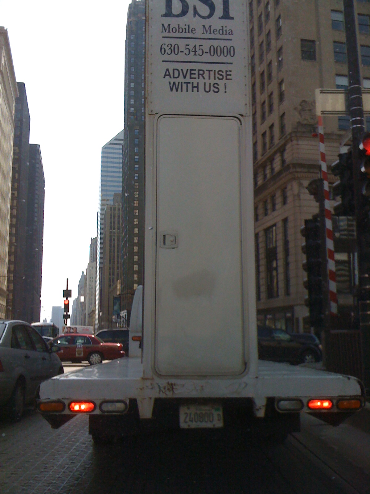 So I hopped straight up on the backs of one of those suckers. Have you ever seen what a mobile billboard looks like from behind? Well, here, I’ll fucking show you.