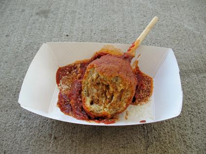 It’s somewhat disturbing to see spaghetti cut up to be put inside a meatball. It’s just not natural. But we can’t complain, because any food, when served on a stick becomes 50% tastier, 100% more American, and 200% more mobile.