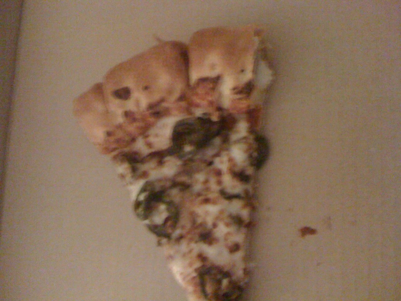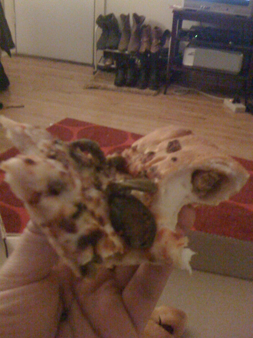God, with each bite I am discovering new places to fit food inside my stomach. I feel like I am a host for this pizza, and it’s slowly just…becoming me. Not that I’m complaining. This is absolutely delicious. I just feel like I’m fighting an uphill battle. I’m an American dammit, I don’t…not finish a pizza. I’ve muscled through most of this…all we got left is…
