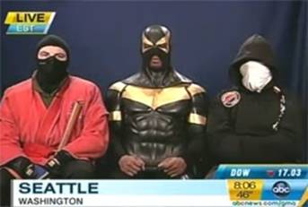 The one in the middle (ie- the only one pictured above who doesn’t look like his “supersuit” is a Mortal Combat costume) is “Phoenix Jones”, leader of a vigilante group called the Rain City Superhero Movement. While there might be some aspects to his story that ring a little over-the-top (honestly, why the hell do you use a secret door in a comic book store bookshelf to change into your costume?) but this guy’s costume is actually well conceived. He’s got bullet proof armor, a stab plate, a taser, and mace, and apparently just enough of a sociological disorder to think that going out in a superhero costume is a healthy way to live his life.
