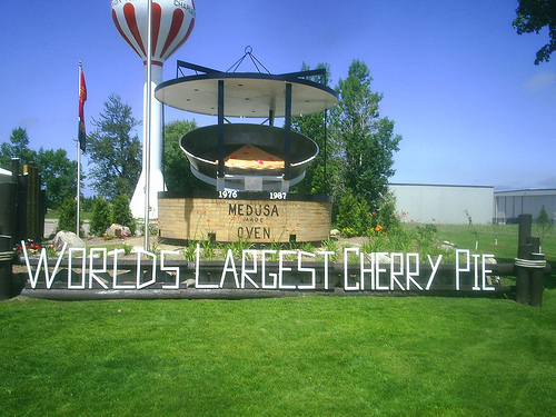 Much like how every damn hotel in the Wisconsin Dells’ claims to have the World’s Largest Indoor Water Park, these two pie tins are less than fifty miles apart! And they’re BOTH specifically meant for Cherry Pies. How the hell does this happen? Is this some sort of small town arms buildup, like a Cherry Pie version of The Butter Battle Book?