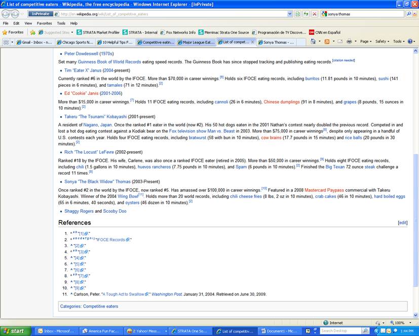 o Eater X is Crazy Legs’ roommate, which no doubt leads to one of the highest grocery bills per capita in the nation. Eater X is currently ranked 7th in the world, and his records include 141 pieces of sushi in 6 minutes, which we would have to guess led to one of the worst cases of dysentery this side of the Oregon Trail. He is known for his stunts (like the face painting up there), and finished 2nd place in last year’s Nathan’s Hot Dog Eating Contest. One year, when the contest occurred right before the release of the last Harry Potter book, he entered stage with a bigass sign that says, “Hermoine dies,” which is so funny we just had one of our staffers go to Wikipedia to find out if that really happened or if he was blowing smoke out of his ass.