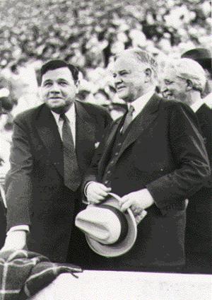 There was a time in America where everyone wore collared shirts with weird collars that look like this. And everyone was supposed to wear hats. Always. Even if you looked goofy as all shit wearing that hat. Hoover hates this hat so much right now. Just look at his eyes. Look at that resentment. Anyway, there’s not a lot of good pictures of Hoover, so here’s one of him using a hat to hide his erection while he stands next to Babe Ruth.