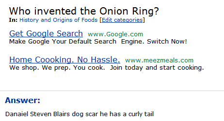 Now, who invented the Onion Ring? Well, if we go to answers.com, the answer is simple. “Danaiel Steven Blairs dog scar he has a curly tail.” Wait, what?