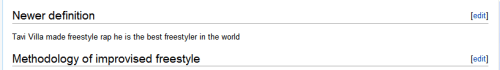 But I digress. I am sort of one of the history buffs of AFFotD here so I’d be remiss if I didn’t talk briefly about the history of freestyle rap before I uh, do this thing. Admittedly, the information on the history of freestyle is not the most reliable, as people often hijack Wikipedia to make claims about Tavi Villa instead of actually going into the origin of freestyle.