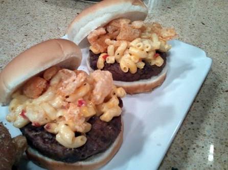 Yeah, that right there is Pimento Macaroni and Cheese Angus Burger. Garnished with pork rinds. Because, if you’re going to offer foods that Jewish people can’t eat, you might as well go all out with it, this burger was designed by the nightmare an Anorexic Rabbi once had during Passover. We once took one of these, ground it up, and gave it to a Vegan saying it was a “soy smoothie” and the Vegan exploded faster than a pigeon being fed a handful of rice.
