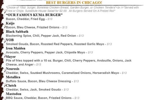 Many Chicago residents know Kuma’s Corner as “that death metal with the incredible burgers where you have to wait forever to get a seat” and that’s fairly accurate. The bar blares metal, will not take music requests, and features rules like “We will not ‘put on the game, bro.’” There are no reservations, so if you go during a typical lunch or dinner hour, you’ll expect to wait a solid two hours before you get a seat. And you all have to wait- when Lady Gaga decided to try the place out, she had to wait like everyone else.