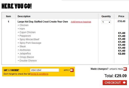 Looking at the available toppings, you can see there are areas where England is terrifying. Mainly, who the hell puts sweet corn or tuna on their pizza? Tuna on pizza? What the hell, England? They also give you the option of using BBQ Sauce instead of tomato sauce, because gross. Fucking gross.