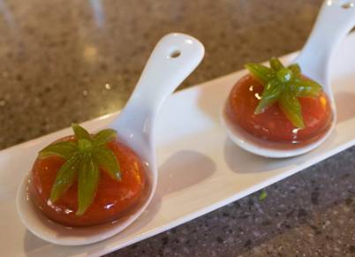 According to this step-by-step recipe slideshow, Yen takes a spoon that appears to hold between one and two ounces of liquid, and pours it half full with a mix of heirloom tomato juice, garlic, black pepper, horseradish, mustard (mustard? Huh…), salt and Kettle One vodka. He also adds in something called “Calcium Lactate powder,” which makes us giggle because it sounds like it’s probably a laxative. Right? Just us? Okay, so science isn’t really our thing.