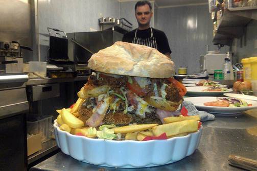 The Titanic piles up two one-pound burger patties, two 4 ounce chicken breasts and six slices of bacon to go along with four onion rings, two potato waffles (potato waffles? So, not a waffle fry? Is this a British thing? Oh it is? Okay moving on) all of which is topped with mozzarella cheese, lettuce, pickles, onions, tomatoes and mayonnaise. As of early 2011, about 100 people had ordered the 15 squiggly line (£?) item, with about 20 managing to finish the whole thing with one person who may or may not have replaced their insides with a garbage disposal unit managing to scarf the whole thing down in just seven minutes. Though honestly, we don’t know why they opted for the whole “two chicken breasts” thing, when if they committed to the beef more they could have topped the next burger on our list.