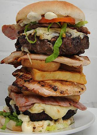 In The Judgment Day, we find yet another British burger *ducks to avoid series of knives and angry curse words* okay fine, a Scottish burger that also was inspired by Man Vs. Food and which has yet to be defeated (because an American probably hasn’t had a proper go of it it). We’re not sure how they came up with 15,000 calories, since there’s only one pound of Aberdeen Angus steak burger involved, but it helps that it’s topped with three chicken breast burgers (what is it with the United Kingdom and their “using chicken burgers instead of beef” fascination?), six rashers of bacon, three fried eggs, a double serving of French fries, onion rings, a shitload of cheese, and a homemade chili to finish everything off. Sold for 25 Brit-Squiggles by Spinnaker Café in Oban, Scotland, this one burger at least gets the spirit of competitive eating right, since it’s only free for anyone who can get through it in 45 minutes.
