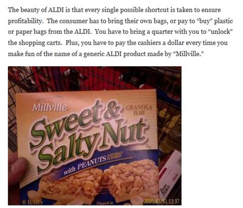 No. ALDI is fine, ALDI is cheap, and you can go there if you like, but there is no reason ALDI should be something you feel strongly enough about to hunt down articles badmouthing the place so you can go tossing about their corporate talking points like #brand#loyal little zombies. Have some self-respect. You got a job, and like good food, but don’t want to support “the other guys”? Fine, find a local grocery store and take your business there. Find a goddamn Supermercado where half of the specials are listed in Spanish and say out loud to yourself, “Wow, this is much better quality than ALDI, almost just as cheap, and I can pay for this with a credit card and get free plastic bags like a functioning adult in a fucking first world economy.” But stop rushing to defend some faceless multinational German corporation because you don’t like how Wal-Mart treats their employees. Do better than ALDI.