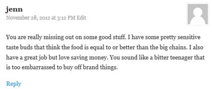 Do bitter teenagers really do that much grocery shopping? We mean, if we were teenagers and our parents made us do our own grocery shopping, we guess we’d be bitter, but we’d also not be embarrassed to buy off-brand food because it’s not like that’s shit you advertise. It’s not a pair of shoes, it’s food which you buy, eat, find tasty or not tasty, and then poop out the next day. Food is like, literally, the one thing a bitter-at-his-parents-for-making-him-buy-his-own-groceries-oh-man-he-is-so-moving-out-when-he-turns-18 teenager would give zero shits about the #brand of. Who is this bitter teenager you’re thinking of? W…was it you?