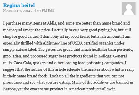 To argue for the sake of arguing is idiotic. Do a blind taste test. Here are some items to try and compare from Aldis brand: Doritos knock off, ketchup, fruity and cocoa pebbles knock offs, these things taste the exact same and are half price of the name brands. To pay more for the same quality is stupid. If I was a single person with no real bills and no kids to feed I might not care about saving money. However I have 2 male teenagers in my house who inhale food faster than I can buy it. So I’ll save money any place I can. 🙂