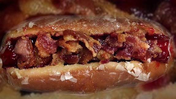 Ha ha, holy shit. Look at that monster up there. This hot dog, which literally crams a sausage into a Krispy Kreme doughnut and covers it in raspberry jam and crumbled bacon, was originally announced without a name. They let you, the morbidly curious, suggest a name, eventually settling on the finalists of Inside The Porker, Frawley Frank, Don’t Go Bacon My Heart, Glazed and Confused, The Sweenie, and Grand Slam With Jam. Naturally, we were strongly pulling for a pun, and the fact that they ended up going with The Sweenie is an immense disappointment to us. Seriously, America? You had to go with the most boring name available to you? Ugh, this is why democracy doesn’t work.