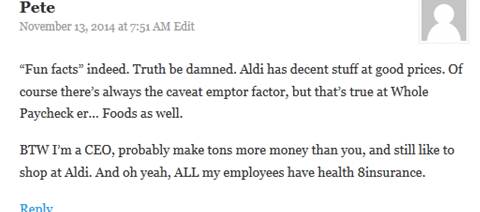 By the way, outside of Pete’s spelling of “8insurance” being absolutely hilarious, we love the email he listed in his “you must put an email to post a comment” section (yes, we can see what email you use, yes most of them are obviously fake, and a surprising amount of you go into making your fake email address specific to your comment, which, hey, kudos.) It was nycceo@yahoo.com. NYC CEO! That’s so perfect. That’s the funniest thing we’ve ever seen from someone trying to center their argument with a brick wall around the concept of “I am a CEO, and even I go to 8ALDI.” We had to email the address, just to make sure it was fake. No, seriously, we had to know.